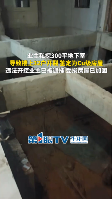 业主私挖300平地下室,导致楼上32户开裂,鉴定为Cu级房屋。违法开挖业主已被逮捕,受损房屋已加固